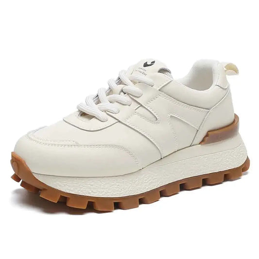 SOMILISS Beige Leather Round Toe Lace-Up Sneakers